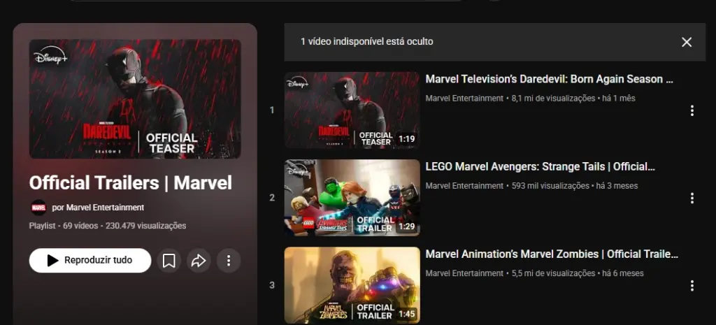 A playlist inclui trailers dos filmes e séries live-action do MCU, animações e especiais do Disney+. Mas dentro dos 69 vídeos da playlist, apenas 1 está indisponível.