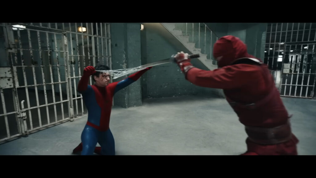 Sim, ele enfrenta uma organização de ninjas assassinos com o rosto completamente exposto. No entanto, o mais impressionante é que as teias orgânicas do herói destroem a lâmina de um ninja como se fosse vidro. Um nível de poder que nunca vimos antes.