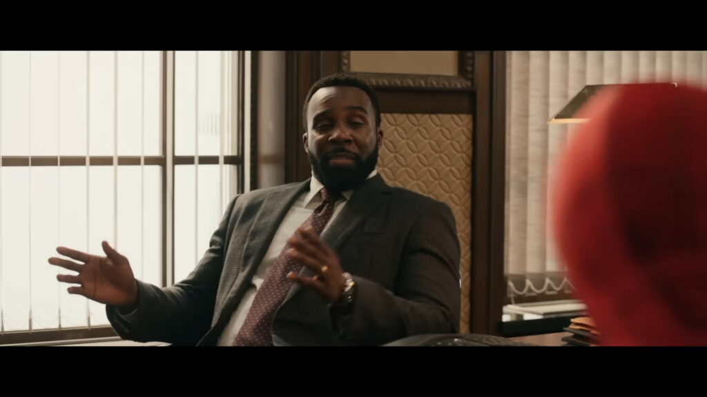 Primeiramente, um dos momentos mais discretos do trailer traz o William Metzger, personagem do Tramell Tillman (Ruptura), conversando com o Homem-Aranha. E o detalhe que passou batido é que a cabeça do herói aparece brevemente no canto da tela, sendo fácil de não perceber.