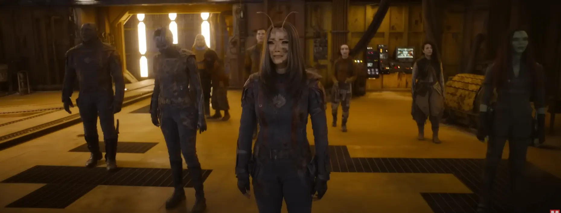 Nesta cena, que parece ser do fim do filme, vemos a equipe reunida, bem acabada e com feições tristes. Porém há três membros dos Guardiões faltando nessa cena: o Senhor das Estrelas, o Rocket e o Groot.