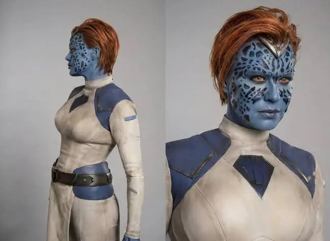 Diferente de suas aparições anteriores, a mutante não está mais nua. Ela aparece com seu cabelo ruivo e a pele azul marcante, honrando a estética clássica da personagem. Mística também usa um traje branco de gola alta com detalhes azuis.